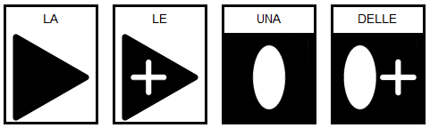 Per contribuire alla completezza del sistema simbolico e a eventuali necessità derivanti dall’apprendimento della lettoscrittura, abbiamo realizzato i simboli mancanti utilizzando le stesse convenzioni stabilite da ARASAAC per i quattro simboli esistenti, invertendo il contrasto bianco/nero per differenziare il genere. A tale proposito, sottolineiamo che lo spagnolo (a differenza dell’italiano) prevede il plurale dell’articolo indeterminativo “unos/unas” ed è dal suo simbolo (reperibile nella versione spagnola) che siamo partiti per ricavare il partitivo femminile.
