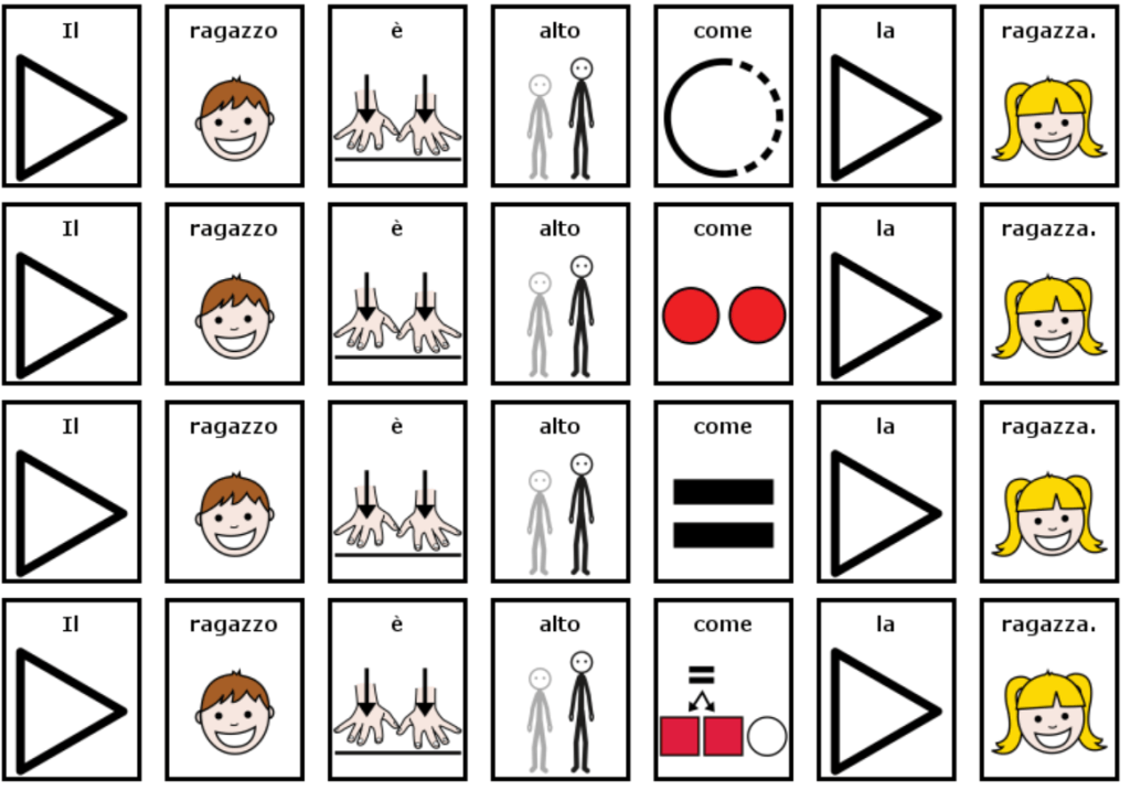 - spesso ci si trova ad avere bisogno di simboli nuovi, che però vanno creati in maniera coerente allo stile del sistema simbolico utilizzato nonché poi “testati” con i lettori con Bisogni Comunicativi Complessi.