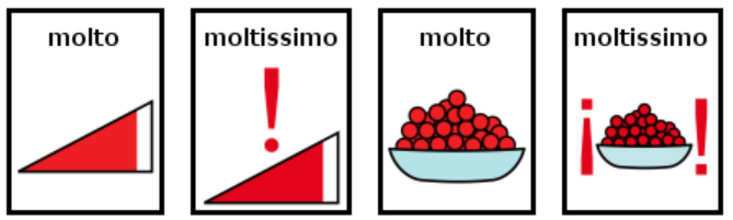 Per quanto riguarda i superlativi, in ARASAAC, li ho visti resi talvolta con l’aggiunta di un punto esclamativo anche se, seguendo sempre i principi della scrittura controllata, consiglio di renderli anteponendo il “molto” all’aggettivo o ripetendolo due volte (“Il quadro è molto bello!” o “Il quadro è bello bello!), come del resto previsto in italiano. Quest’ultima opzione è quella con cui si possono rendere anche diminutivi e accrescitivi.