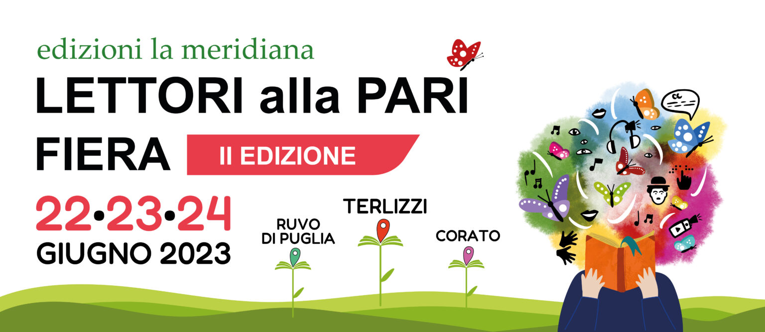 Il 22, 23 e 24 giugno, a Terlizzi (BA), presso la Fiera Lettori alla Pari, sarà possibile incontrare editori e autori, partecipare a convegni, presentazioni, workshop e laboratori, incontri di formazione ed esperienziali organizzati dalle edizioni la meridiana e dai partner di progetto Centro Documentazione Handicap e Cooperativa Sociale Zorba, insieme alle case editrici e associazioni che saranno presenti in fiera.