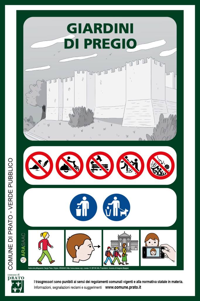Il contributo della Fondazione è stato quello di supportare il Comune nel cercare di aumentare l’accessibilità comunicativa dei cartelli, selezionando insieme ai tecnici messaggi e relativi pittogrammi che espandessero la parte normativa, già presente nei cartelli in forma iconica, con suggerimenti di fruizione dello spazio, così che i cartelli comunicassero non solo cosa si deve o non si deve fare negli spazi, ma anche cosa si può fare negli spazi, come si può beneficiarne, dando risalto quindi all’aspetto esperienziale e cercando di facilitare partecipazione e convivenza negli spazi.