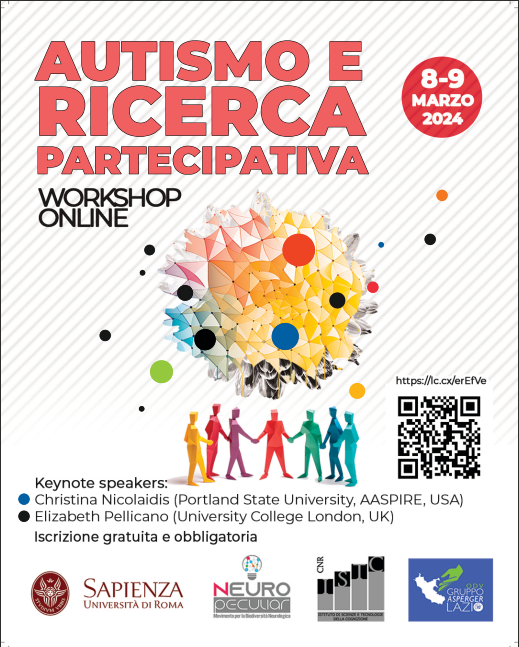 Il workshop è parte del progetto di Terza Missione ‘Ascoltare la Comunità Autistica’ della Facoltà di Medicina e Psicologia, Sapienza Università di Roma, in collaborazione con il Gruppo di Lavoro Ricerca Partecipativa e Autismo, Neuropeculiar APS, ISTC-CNR.