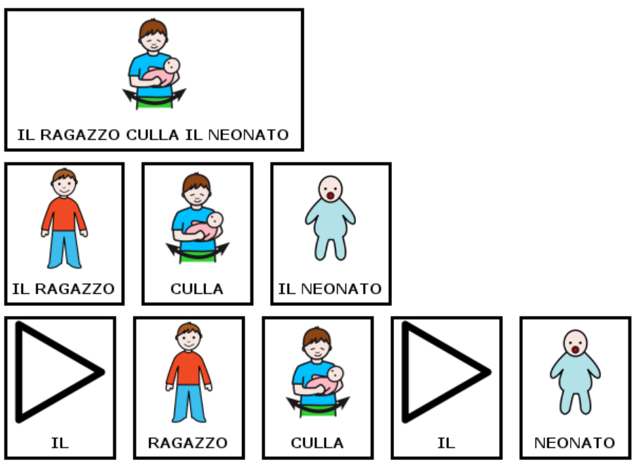Ultimo suggerimento (ma non per importanza) è quello di decidere come aggregare/separare gli elementi della frase, in maniera da mantenere questa scelta in tutto il testo. La frase “Il ragazzo culla il bambino” può, per esempio, essere resa con uno, tre o cinque simboli, come si può vedere nell’immagine sottostante.