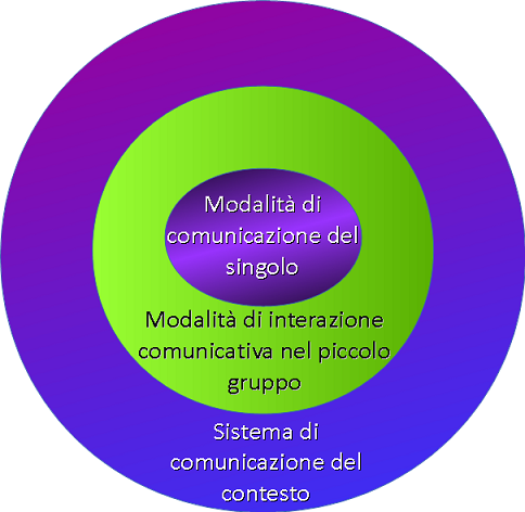 Visual for all articola i livelli di analisi e di intervento in tre livelli concentrici, individuando un livello macro nella struttura topologica e organizzativa del contesto/ambiente preso in considerazione (es. un edificio scolastico ma anche un sito web), un livello méso nella strutturazione del setting in cui la persona con Bisogni Comunicativi Complessi si troverà ad interagire (es. la classe) e un livello micro, riferito al livello di sistema di comunicazione interpersonale utilizzato dal singolo.